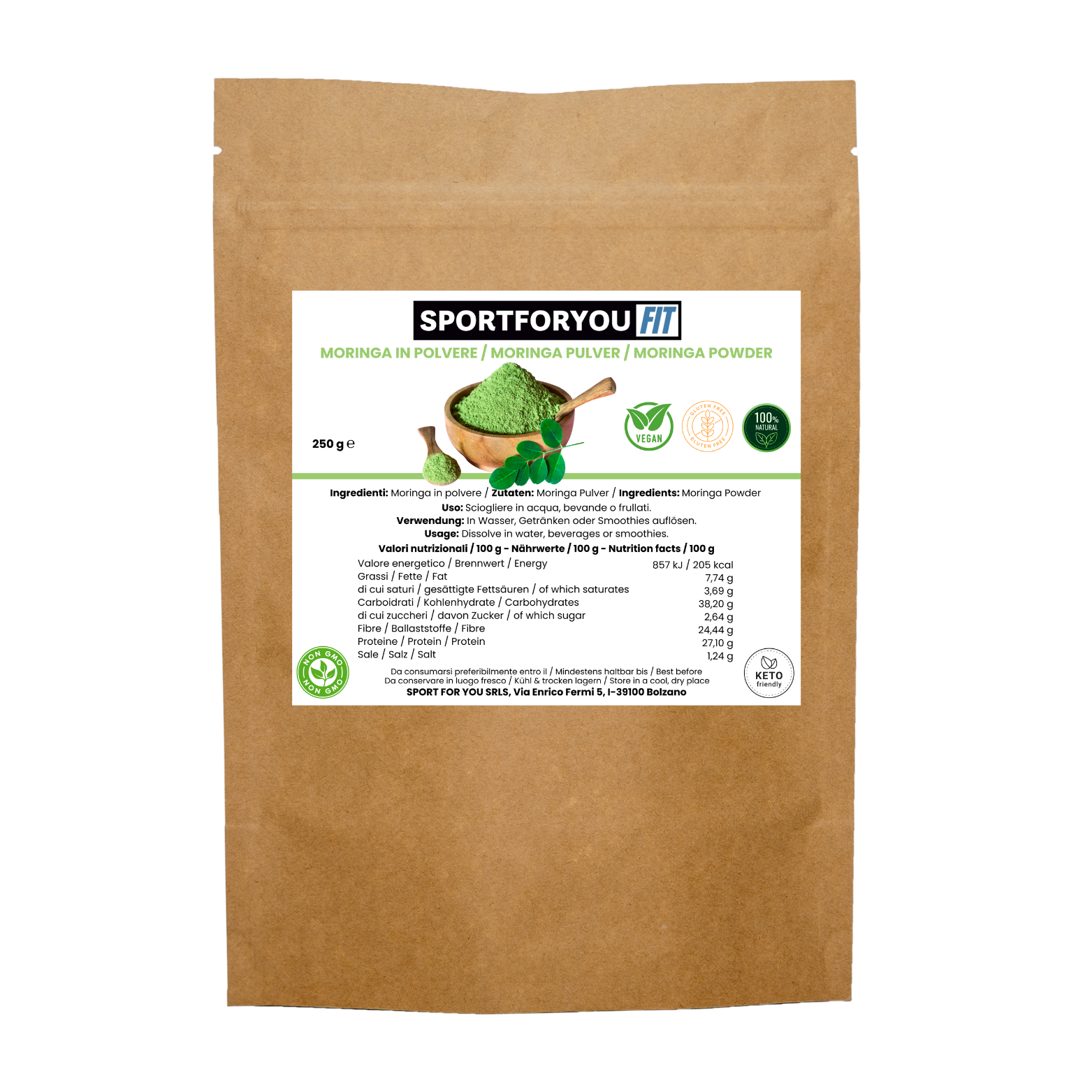 La polvere di moringa è ottenuta dalle foglie essiccate e finemente macinate della pianta di moringa (Moringa oleifera). È una fonte vegetale naturale ricca di fibre e contiene proteine. Dal gusto leggermente erbaceo, è ideale da aggiungere a frullati, smoothie, succhi o ricette da forno.
