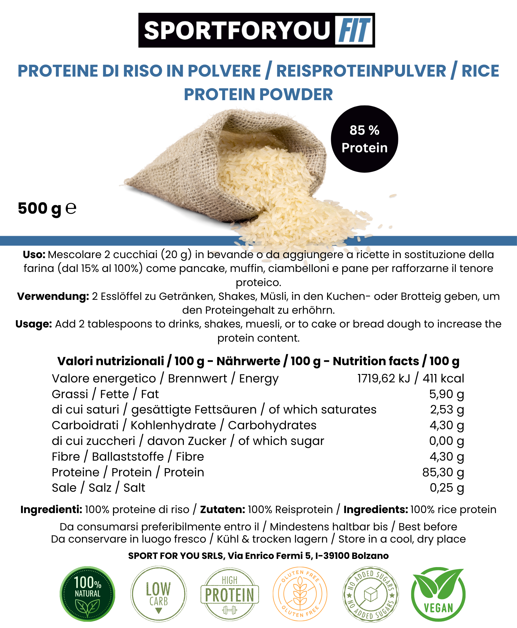 Le proteine di riso in polvere sono una fonte proteica 100% vegetale ricavata dal riso integrale. Contengono un elevato contenuto di proteine e sono naturalmente prive di lattosio e glutine. Dal gusto neutro, sono ideali per frullati, smoothie o per la preparazione da forno. Le proteine contribuiscono alla crescita e al mantenimento della massa muscolare e al mantenimento di ossa normali.